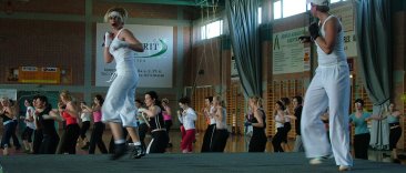 A lelátón ülõ nézõket is pörgésre szólította fel Garai Sz. Imre mûsorvezetõ. Egyre többen lettek a küzdõtéren, és mozogtak a jó zenére, az elismert elõadók edzés módszerei szerint.