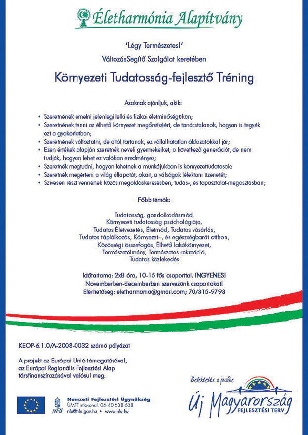 Beküldve a(z) Aktuális, Újság cikkei kategóriába | Az Életharmónia Alapítvány környezeti tudatosság-fejlesztő tréningeket szervez bejegyzéshez a hozzászólások lehetősége kikapcsolva