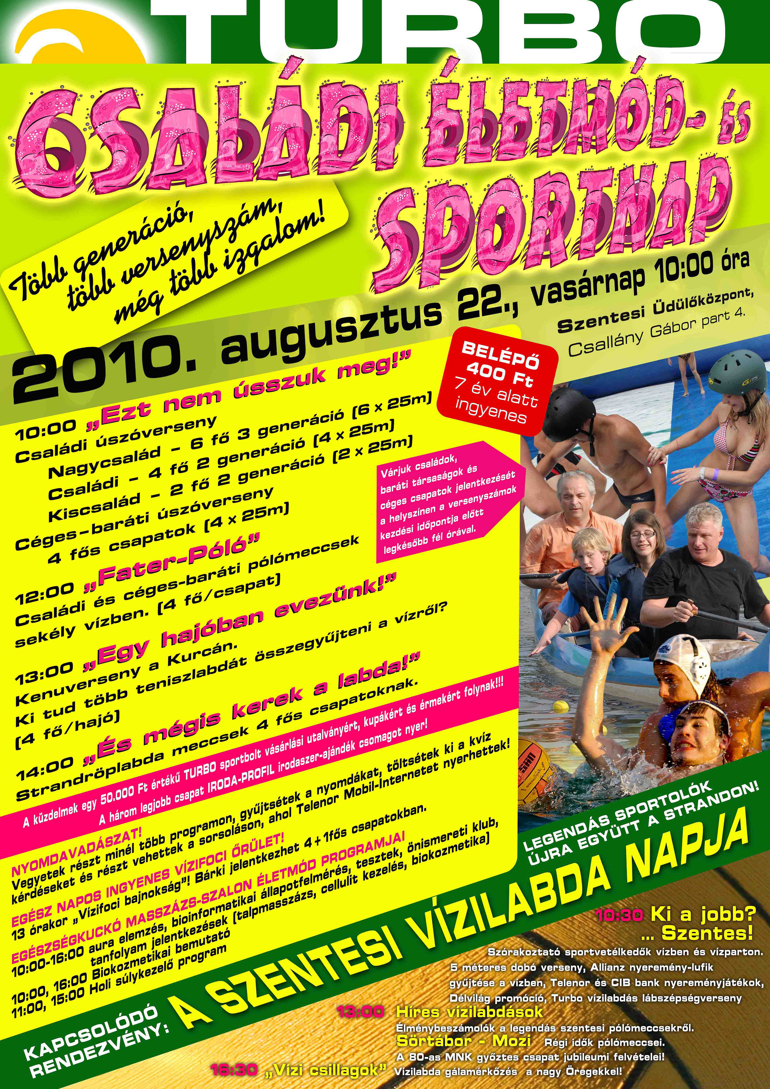 Ez a nap kiváló céges csapatépítő programnak, ahol a kollegák játékos vetélkedőkön (vízifoci, kenus ügyességi verseny, vízipóló, úszóverseny, röplabda) mérhetik össze tudásukat több csapattal. Gondoltak a baráti társaságokra is: mindazokra, akik szeretnének együtt, kellemes környezetben eltölteni egy sportos napot és késő délutánra értékes nyereményekkel gazdagodni. A részletekért tekintse meg a rendezvény plakátját (kinagyítandó)! Augusztus 22-én a Szentesi Üdülőközpontban önökkel is találkozzunk!