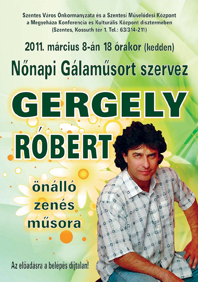 Szentesen március 8-án, a Nemzetközi Nőnap alkalmából. Az ünnepelteket a Megyeháza Konferencia és Kulturális Központba várják 18 órára. (Plakát kinagyítandó!)