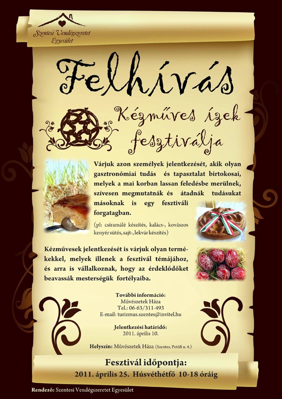 Szentesi Vendégszeretet Egyesület hagyományteremtő szándékkal új rendezvényt indít. A rendezvény neve: Kézműves ízek fesztiválja. Helyszín: Művészetek Háza Szentes, Petőfi u. 4. Időpont: 2011. április 25 Húsvéthétfő 10-18-ótáig.