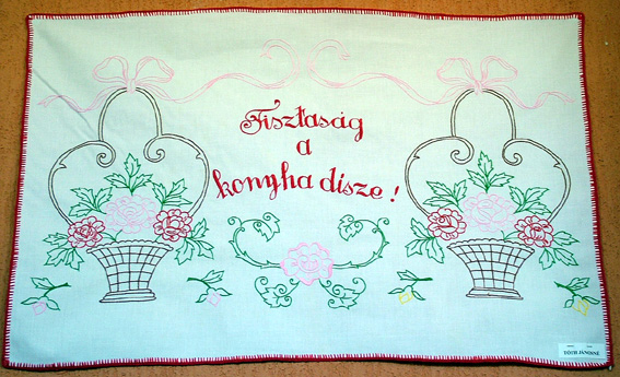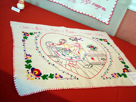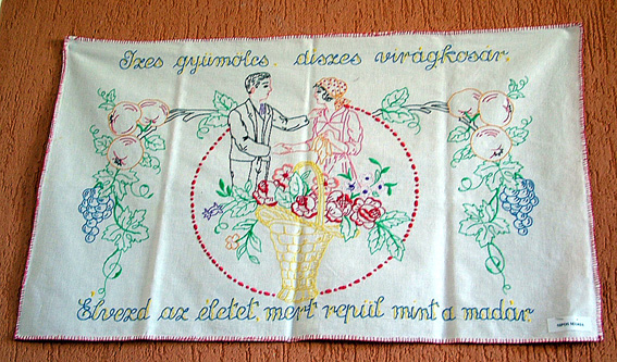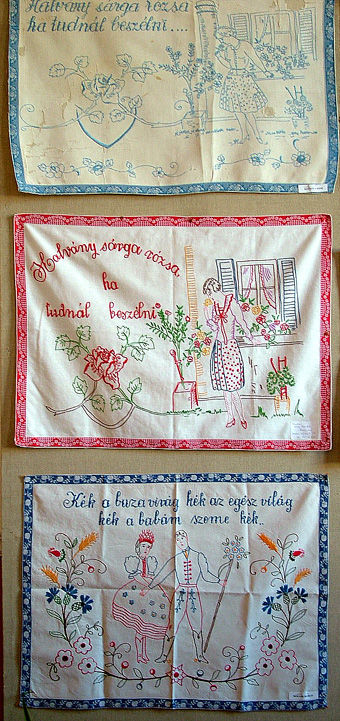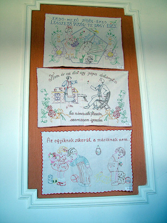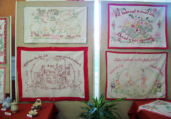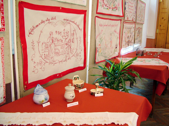 Különféle stílusú sótartók, a korabeli ökörszarvból készült darabtól a hajdani fából készült, népi motivumokat hordozó sótartóig, s Kovács Ivánné bútorfestő szebbnél szebb darabjai ejtették ámulatba a közönséget. A hangulatos kiállítás legrégibb falvédője az 1920-as években készült. A több mint negyven kézimunka zöme azonban a hetvenes-nyolcvanas évekből származik. E használati tárgyak funkciója az volt, hogy a konyha falát védjék. Korábban általában egyszínű fonalat használtak a hímzéshez, abból gazdálkodtak, ami otthon éppen akadt. Ugyanez jellemezte a szélek eldolgozását is. Ha telt rá, szélszegőt vásároltak, ám ha nem, a pelenkaöltés is tökéletesen megfelelt a célnak.