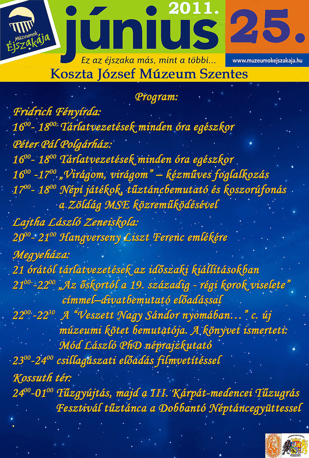 Az idei program idõpontja június 25. A Koszta József Múzeum 18 órától várja a gyerekeket és szüleiket. A résztvevõk elõadásra, koncertre, csillagászattal kapcsolatos kiállítás megnyitójára, kézmûves foglalkozásra is számíthatnak.