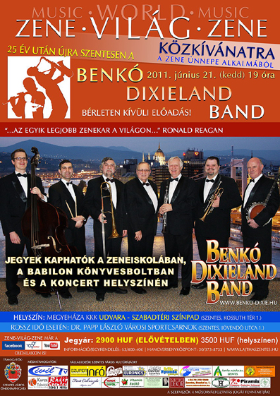 25 év után újra Szentesen muzsikál a Benkó Dixieland Band. A zene ünnepe alkalmából, közkívánatra láthatják és hallhatják õket a Megyeháza udvarán (rossz idõ esetén a sportcsarnokban) június 21-én 19 órától. A koncertet hangversenybérleten kívül rendezik. Jegyek elõvételben 2900 Ft-ért válthatók a zeneiskolában vagy a Babilon könyvesboltban. A koncert elõtt váltott jegyek 3500 Ft-ba kerülnek.