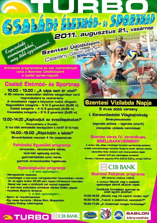 Augusztus 21-én vasárnap a Szentesi Üdülőközpont Nkft. szervezésében a Szentesi Vízilabda Napja, valamint a IV. Strandkupa, Snellsakkverseny és számos játékos vetélkedő szórakoztatja a kilátogató családokat. A mellékelt program kinagyítandó.