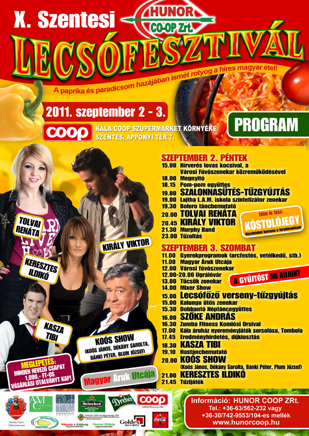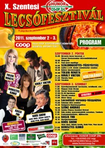 Ha szeptember elsõ hétvégéje, akkor Szentesen Lecsófesztivál. Az idei, jubileumi színvonalát már az impozáns Kála Coop Szupermarket is emeli. Sztárvendégekben és látnivalókban gazdag hétvégére számíthatunk.