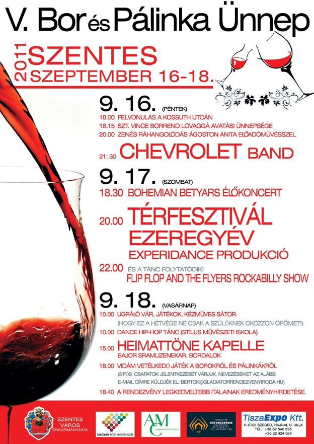 A programok sokszínûsége sok szórakozást ígér. A 16-ai, péntek esti programokat 18.00 órától a Szent Vince Borrend Kossuth utcai felvonulása nyitja meg, majd ezt követõen borlovag avatási ünnepség veszi kezdetét. A péntek esti fõ fellépõ a Chevrolet Band lesz este 21.30-tól.