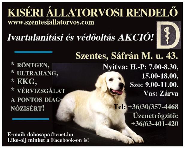 Dr. Dobos András arról is említést tett, hogy a tavalyi nagy sikerû szemészeti konferencia szervezését már megkezdte, sõt idõpontját is kitûzte május 11-ére. Emellett rendszeresen részt vesz az állatorvos hallgatók egyetemi oktatásában is. A fiatal szakemberek közül néhányan az idén felkeresik majd a kiséri rendelõt, mert gyakorlati ismereteik megszerzésének bázisa lesz a Sáfrán Mihály utcai eszközpark.