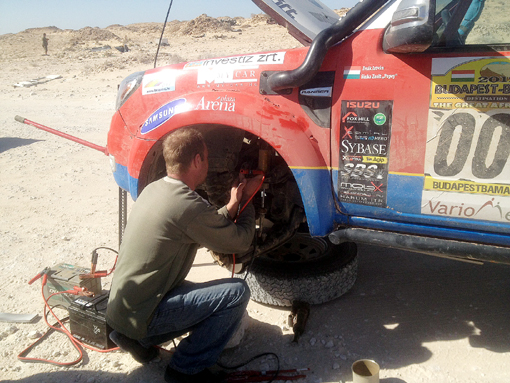 Egyszer észrevettük, hogy olyan érdekesen megy az autó. Pisti kiszállt megnézni: semmi. Gurulunk kb. 5-6 métert és hopp, már gumi szag is van. Kiszálltunk és elég komoly baj tárult elénk: egy felső lengőkar törés. Hál’ istennek, nekünk nem lett bajunk, mivel történhetett volna a tegnapi gyors szakaszon 150 km/óra körül is. Egyből gondolkozás, mit tudunk csinálni, ahol a törvénytelenség az úr. Jöttek a csapattársak, nagyon segítőkész volt mindenki. Különösen két csapat, akik kijelentették, hogy nem hagynak bennünket itt. Utána egy számomra hihetetlen dolog történt: hegesztés kettő db. akkumulátorral, szöggel és dróttal. Ez sajnos nem volt olyan jó megoldás, de a helyszín mást nem engedett meg – két méter után ismét eltört.