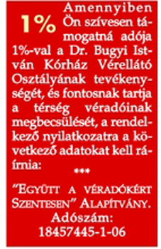 Évente egyszer, a Véradók Napja alkalmából jutalmazzák az alapítvány alaptõkéjének kamatából, valamint a befolyt 1%-okból mindazokat, akik hoszszú évek óta rendszeres véradók, és azzal, hogy karjukat nyújtják, mások egészségéért tesznek felbecsülhetetlen szolgálatot. Most itt a lehetõség, hogy adója 1%-ával ezt az alapítványt támogassa véradó és nem véradó egyaránt.