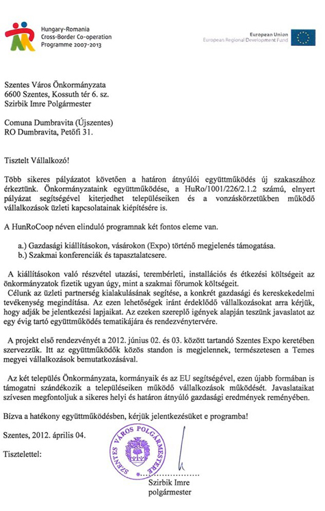 Szentes városa és testvértelepülése a romániai Újszentes határon átnyúló együttműködése keretében Európai Uniós források bevonásával kívánja idén, június 2-3-án a hagyományos Szentes Expót megrendezni.