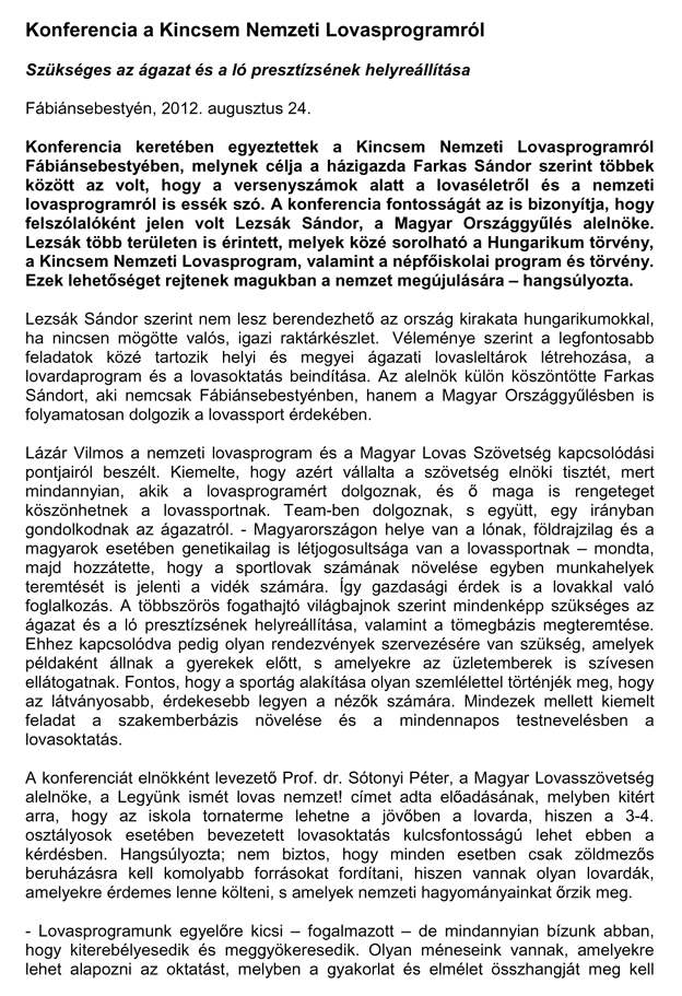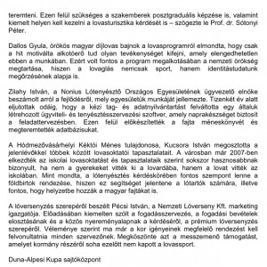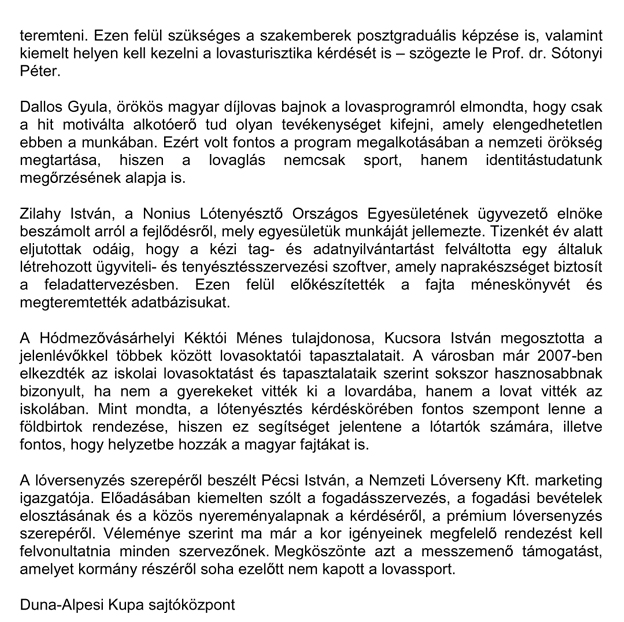 A Duna-Alpesi Kupa nemzetközi fogathajtó verseny keretein belül megtartott Kincsem Nemzeti Lovasprogram Konferencia összefoglalóját alább közöljük. A verseny hivatalos honlapján, a www.fogatverseny.hu oldalon további információk találhatóak.