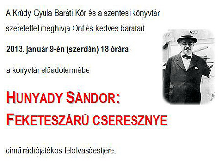 Hunyadi Sándor műve alapján rádiójáték jellegű felolvasó estet rendez a városi könyvtárban a Krúdy Gyula Baráti Kör január 9-én 18 órától. Íme a részletek: