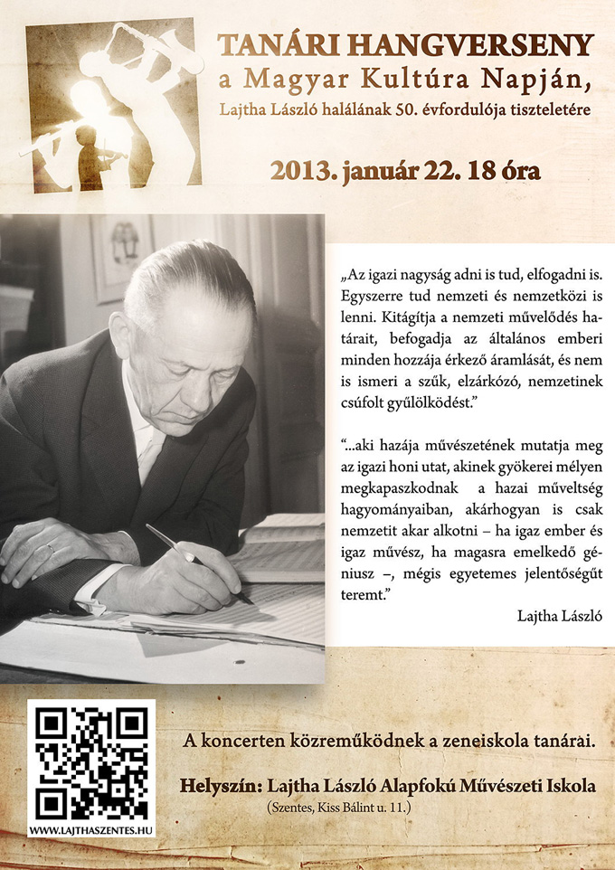 A Lajtha László AMI és Hangversenyközpont tanári hangversennyel emlékezik a Magyar Kultúra Napja alkalmából a zeneirodalom kiválóságaira. (A plakát kinagyítandó!)