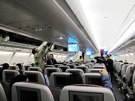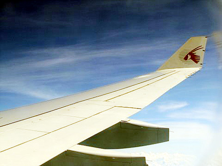 Mivel több millió utazóhoz hasonlóan ez nekem is sértette személyiségi jogomat, hiszen pucér valót csak az orvos vagy a halottkém nézegethet, így változott a módi, és manapság azonos nemünek kell lenni az átvilágítandó utasnak és a FBS monitort nézõnek, a tisztességes utasok felvételei pedig megsemmisítõdnek. Nos, mivel Scwechat ilyen masinkóval még nincs felszerelve, ez a fejezet utamból itt kimaradt így laza könnyedséggel mentem át a régi módi röntgen kapu alatt, ami nem adott éles hangott, hogy menjek át alatta megint, mert valami gyanús van rajtam, hanem zöld lámpácskája jelezte, hogy a repülõgéphez vezetõ út ezen részén is túl vagyok. Az útlevél ellenõrzés – mert jobb többször mint egyszer sem – mit sem jelent itt annak, aki EU polgár, aki viszont – mint jó magam is – ezen a határon túli, az csak várja ki a sorát egy másik ügyintézõ elõtt kanyargó tömegben. Egy pillantás az indulást jelzõ táblára, Qatar Airlines 096-os járata, Doha-ba, 16:15-kor megy. Rövid várakozás a beszálló csarnokban, majd elõször az elsõ, aztán az üzleti, végül a túrista osztály utasait szólítják, soronkénti rend szerint, kezdve ezt a leghátúl ülökkel, hiszen így folyamatosan tölthetõ fel az utastér. Beszálló kártya egyeztetése az utaslistával, kis gyalaglás majd néhány perc múlva elhangzik a bûvös mondat, amiért ez az egész, több mint négy órán át tartó procedúra tartott, Welcome on board. Üdvözöljük a fedélzeten! Köszönt hatalmas mosoly közepette a légikísérõ, majd irányít a megfelelõ folyosó felé. Üdvözlöm magam én is, közben arra gondolva, hogy igaz, hogy ez a köszöntés általában akkor szokott elhangzani, amikor valaki hajó fedélzetére lép, ám már régóta megszokottá vált ez a légiközlekedésben is, ebben az esetben meg kifejezetten találó, hiszen ez a 306 utast befogadó Airbus A340-300 valóban olyan mint egy hajó. Hatalmas légi hajó.
