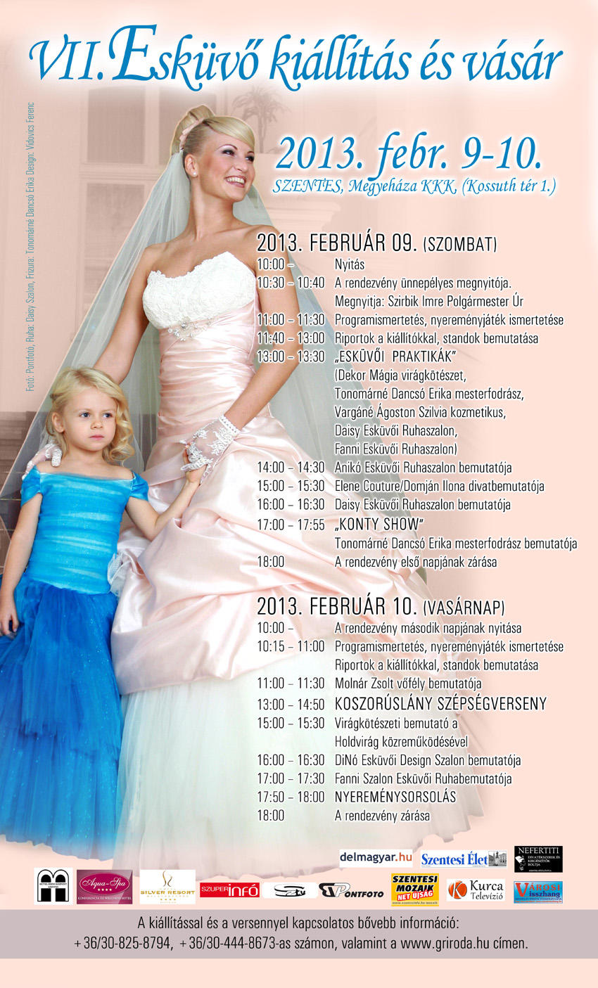 Elkezdődött a visszaszámlálás. Csatoltan tesszük közzé a VII. Esküvő kiállítás és vásár részletes programját, emlékeztetőül. Reméljük, senki sem marad le a kiválasztott látványosságról, és fantasztikus élményekkel gazdagodunk majd ezen a hétvégén.