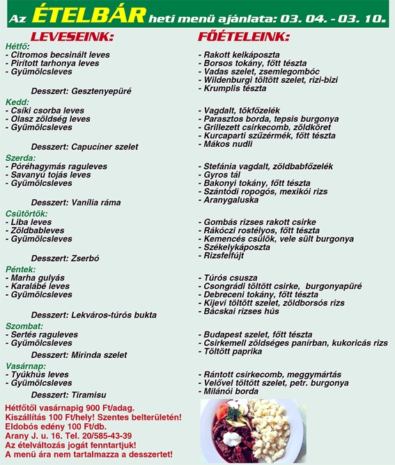E sok finom házias étel közül ön is összeállíthatja étlapját a jövő hétre. Várja az Ételbár, lássuk, mit kínál…