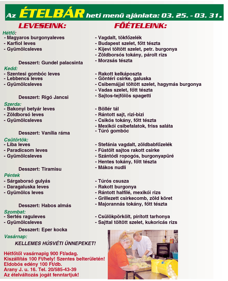 Göntéri csirke, Vadas szelet, Mexikói csibefalatok, Szántódi ropogós, kóstolta már? Ha még nem, most megteheti Szentesen az Arany János utcai Ételbárban! A teljes étlapot kinagyítás után olvashatja.