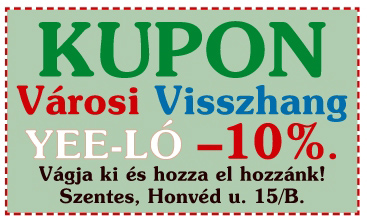 – Igen, kettõ is, ami ugyan nem összevonható, de külön-külön 10%-ot ér. 1. Kivágva a Városi Visszhang YEE-LÓ 10%-ot, átadva a fizetéskor a pincérnek, máris életbe lép az elsõ akció.