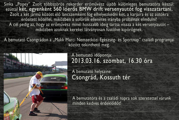 Sinka “popey” Zsolt erõmûvész arról tájékoztatta lapunkat, hogy Szentes térségében az utolsó világrekord kísérletére kerül sor március 16-án Csongrád fõterén. Ez lesz sorrendben a tizenegyedik ilyen “húzása”, amit 16.30 órától nézhet meg az érdeklõdõ közönség a Makk Marci Nemzetközi Egészség- és Sportnap keretében.
