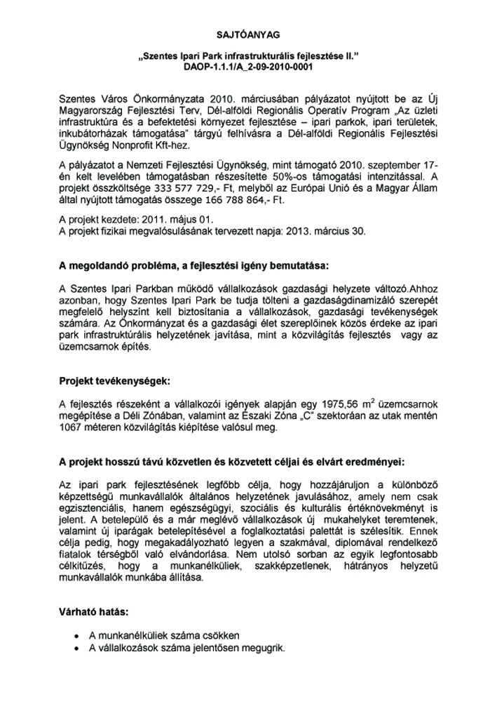 Közel 334 milliós beruházásban készült el Szentes Ipari Parkjának Déli Zónájában az az 1975,56 m2-es üzemcsarnok, amelynek átadására a napokban került sor. A beruházás részeként az Északi Zóna „C” szektorában az utak melletti közvilágítást is biztosították 1067 méter hosszan.