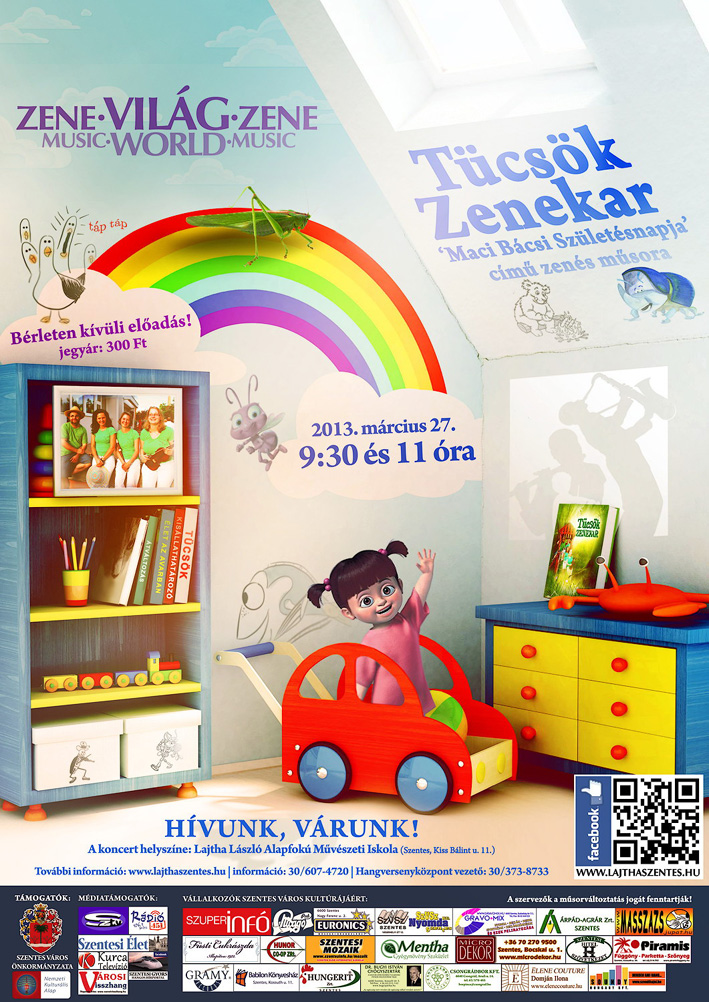 Március 27. (szerda)  9:30 és 11 órakor bérleten kívüli programként a Tücsök Zenekar Maci Bácsi Születésnapja címû zenés mûsora szól a legkisebbekhez. Az együttes 2009-ben alakult Szentesen. Saját meséik, interaktív módon szólnak a gyerekeknek. Mûsoraikban jelenleg ismert magyar gyermekda-