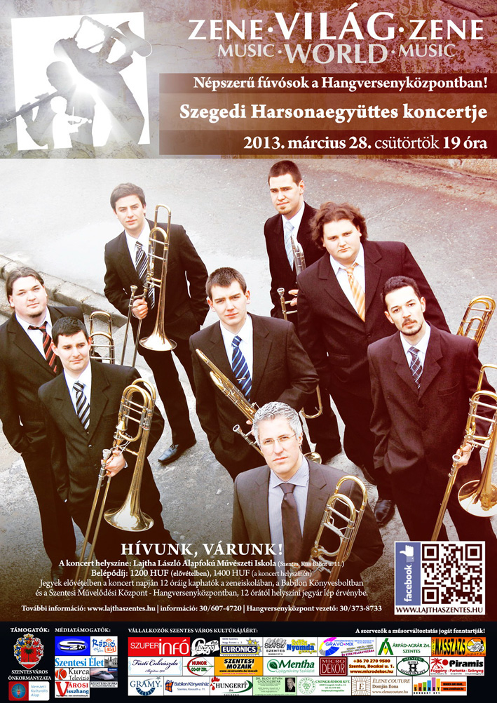 Március 28-án (csütörtök) 19 órakor népszerû fúvósok lépnek a Hangversenyközpont színpadára. A Szegedi Harsonaegyüttest 2008-ban az SZTE Zenemûvészeti karon tanító Gyivi-csán György harsonamûvész, és akkori növendékei alapították. Itthoni tanulmányaik befejeztével kül-földön gyarapították mesterségbeli tudásukat, melyet különbözõ kamarazenei formációban, szimfonikus zenekarokban, ill. szólistaként kamatoztattak.