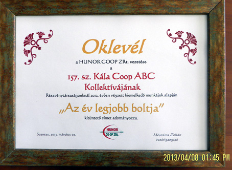 Az elõzõ év legeredményesebb kollektívái a Hunor Coop bálján március 2-án kapták meg az oklevelet és hozzá a meglepetés ajándékot. A Kála Áruház csapata 2012-ben, megosztva a Csanádpalotai Coop Áruházzal örülhetett az elsõségnek. A szentesi kollektíva a jutalom wellness hétvége helyszínét és idõpontját egyezteti, valószínûleg Pünkösdre esik a választásuk.