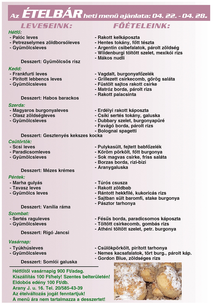 Az Ételbár hétről-hétre változatos és finom házias ételeket kínál. Érdemes megkóstolni, kipróbálni a hét minden napján. Keressék Szentesen az Arany János u. 16. szám alatt.