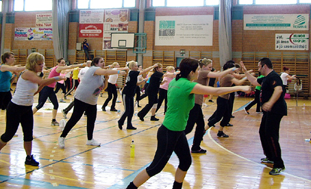 Tempó, hangerõ, sok-sok japán feliratos póló adta a laikus érdeklõdõ tudtára, hogy a küzdõsportra, Kyokushin karatéra épülõ aerobiké a fõszerep ezen a napon. Egy új TÖMEGSPORT született az egészség jegyében.