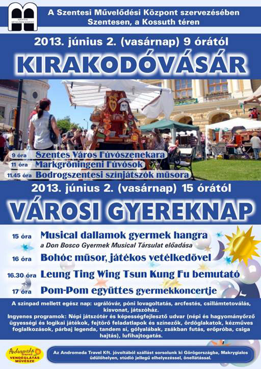 A Szentesi Művelődési Központ szervezésében, a Testvévárosok Kulturális Fesztiváljával egy időben ismét lesz kulturális programokkal kísért népi kirakodóvásár a Kossuth téren, amikor a gyermekek számára is meglepetés programokkal készülnek június 2-án.