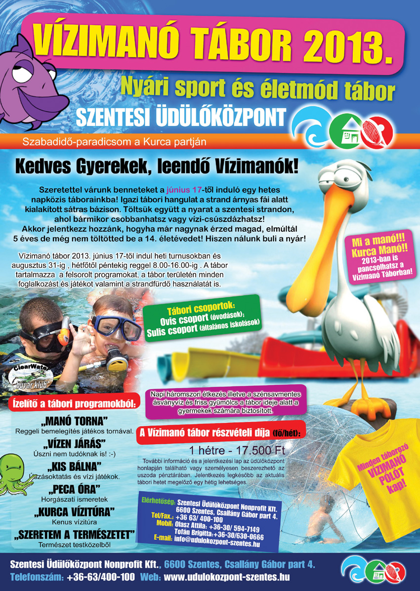 Június 17-21. Vízimanó Nyári Sport és Életmód Tábor – Napközis sport és életmód tábor indul 2013-ban is, egyhetes turnusokban, Szentesi Üdülőközpontban. Információ: Szentesi Üdülőközpont Tel.: 63/400-122