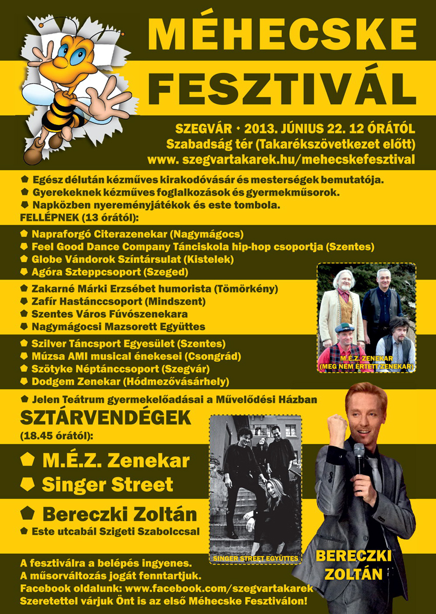 Idén először rendezik Szegváron június 22-én szombaton a Méhecske Fesztivált, amellyel a szervezők hagyományt kívánnak teremteni. A siker érdekében rengeteg fellépővel találkozhatnak az érdeklődők, kipróbálhatják magukat különböző játékokban. Már kora délutántól meg lehet csodálni a kirakodó kézművesek portékáit, melyeken megtalálható lesz a fesztivál névadó rovara.