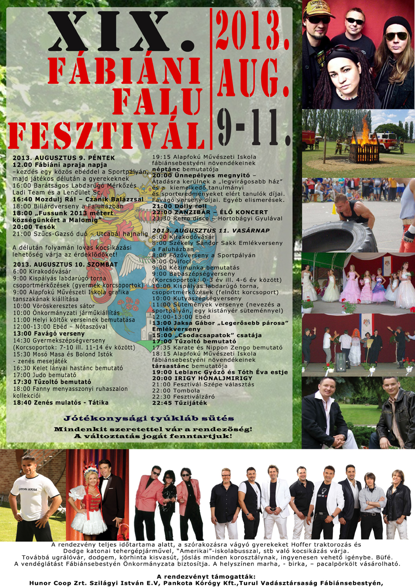 Ismét falu fesztiválra kerül sor Fábiánsebestyénben, a mellékelt programokkal. Kinagyítás után olvashatja a 9-én pénteken délután kezdődő rendezvény részleteit, több már állandó program mellett újdonságokkal és neves fellépőkkel szolgál mindenki örömére a fesztivál.