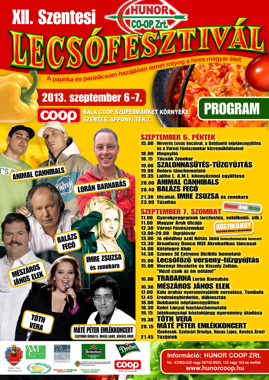 Itt látható a rendezvény sztár fellépőinek a montázsa, tudni érdemes, hogy pénteken este, azaz szeptember 6-án, amikor a rendezvény kezdetét veszi, és ki-ki szalonnát sütve, mások grillezés közben szórakozva este 20 órától az Animal Cannibals műsorával, majd Balázs Feco ismert és szeretett dalaival szembesülhet a színpadon. Majd az Ausztriában élő, szentesi születésű Imre Zsuzsa és a Murphy Band közös koncertje adja meg az utcabál hangulatát.