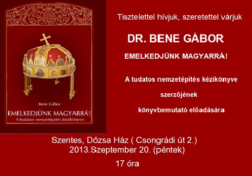 Bene Gábor könyvbemutató.FONTOS és JELENTŐS  KÖNYV JELENT MEG! A Tudatos Nemzetépítés Kézikönyve 1. kötete Dr. Bene Gábor közjogásztól jelent meg, amely Emelkedjünk Magyarrá címen megrendelhető a szerzőtől. Az előszó Wass Albert anyagaiból készült, az utószót pedig vitéz Vesztergám Miklós tárogató művész írta.