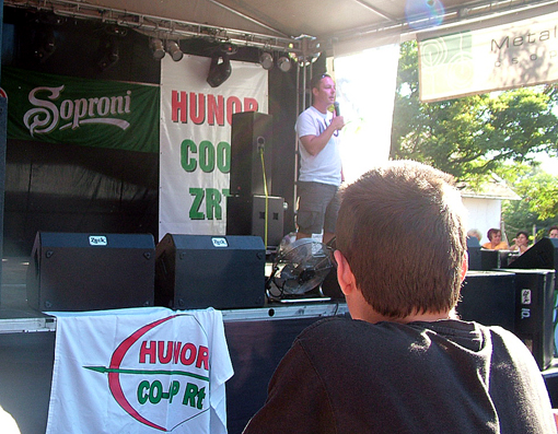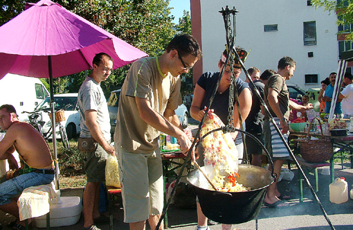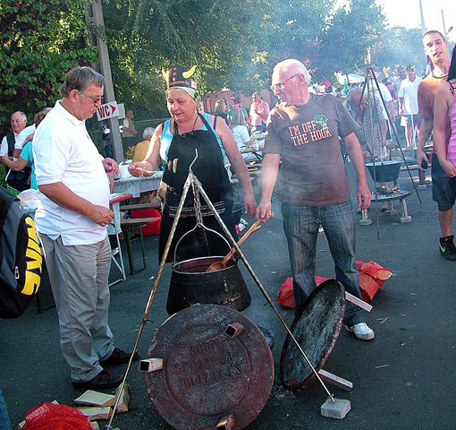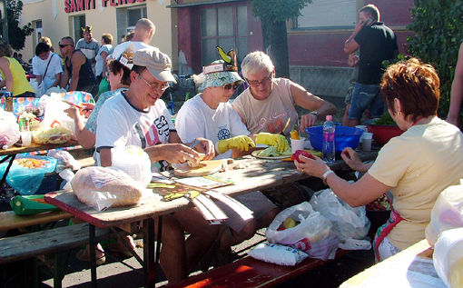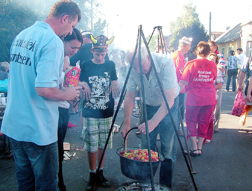 A bográcsok körül kalózkodva az igazi összetartozás hangulata fogadott mindenhol. Kedvencünk, a szegedi 8 éves Kotormán Szimonetta, amint testvérét bemutatta, máris szaladt vissza a bográcshoz, hogy apunak segítsen a kavargatásban. A Csipet-csapat pl. regionális családi együttlétként, míg a kórház Mozgásszervi Rehabilitációs Központjának dolgozói, vagy a Radiológia, de említhetem – sokakkal együtt – a Parkerdõ Otthon csapatát (középsõ kép), a munkahelyi kollektívát kovácsolták összébb a bogrács mellett. A Gondozási Központ 2. sz. Idõsek Klubja kollektívája is szorgosan csiholta a tüzet, míg a gondozottak az ételhez valókat készítették elõ a hûvösben. Helló Pistiék “Szabad a lecsó”-t készítettek. A könyvelõk és ügyfeleik második alkalommal jöttek fõzni, tarhonya, virsli és szalonna került a lecsójukba bõven, és adtak bárkinek, aki kért belõle. Míg mások inkább hústúladagolósra dúsították a közös szerzeményt, ahogy a Hungeritesek, akik a mama igazi házi kolbásza mellé szalámit és lecsókolbászt, de tojást is daraboltak, csökkentve ezzel a zöldségek ízhatását.