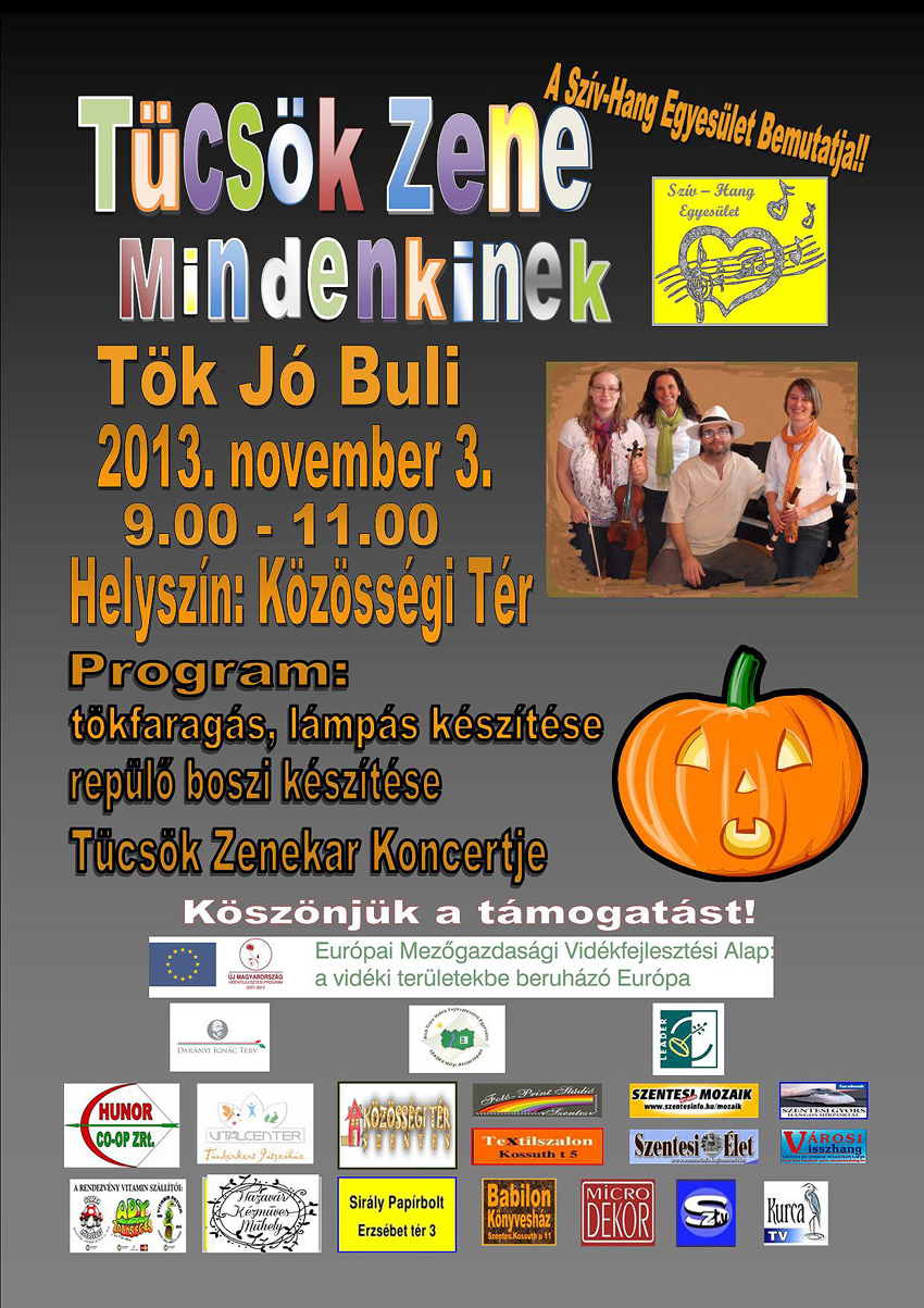A Szív-Hang Egyesület a Tücsök Zenekar rendezvényére hívja az aprókat és kísérőiket. A november 3-án tartandó találkozó azért is Tök jó bulinak ígérkezik, mert a jó zene mellett minden a tökről szól. Az ügyes kezek megmutathatják, mi-mindent tudnak belőle faragni…