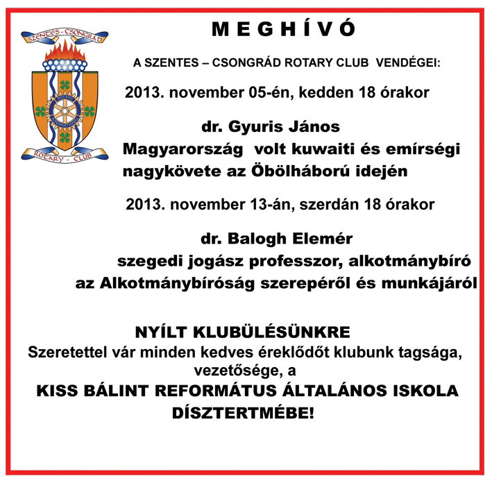 Legfrissebb hírünk, hogy a Szentes-Csongrád Rotary Club két neves és különleges vendégével találkozhat a nagyközönség az elkövetkező napokban. Részletek a meghívóban kinagyítás után olvashatók.