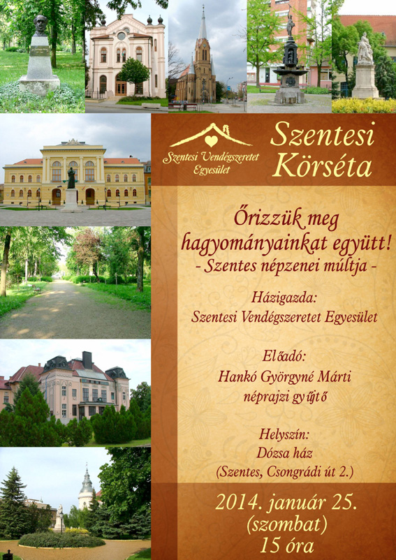 A Szentesi Vendégszeretet Egyesület következõ, rendhagyó Körséta programja a Dózsa házban lesz. Címe: Õrizzük meg hagyományainkat együtt. Szentes népzenei múltjáról Hankó Györgyné néprajzi gyûjtõ tart elõadást. Az érdeklõdõket január 25-én 15 órára várják.