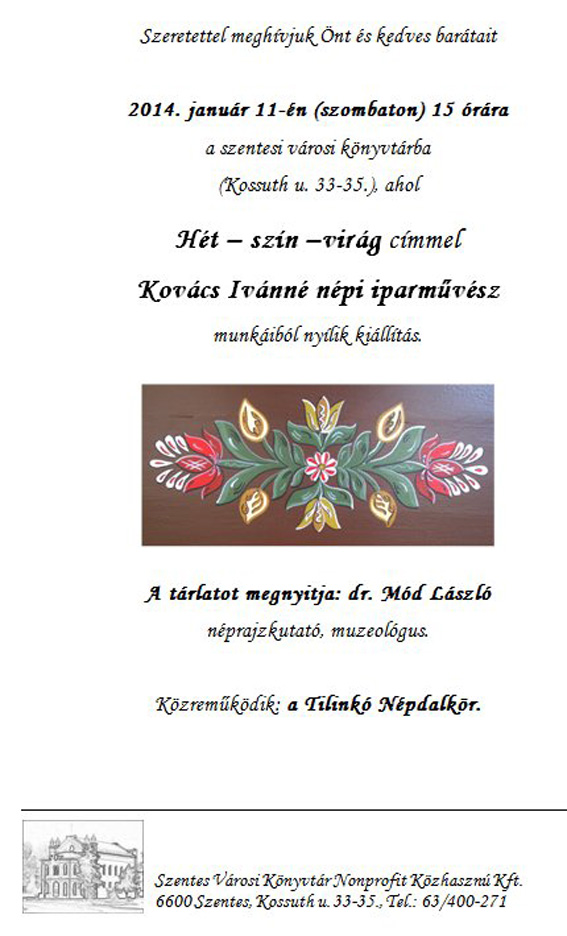 A budapesti Hagyományok Háza Népi Iparművészeti Tanácsadó Testülete „Népi Iparművész” címet adományozott a szentesi Kovács Ivánné bútorfestő munkásságának elismeréseként. Ebből az apropóból nyílik önálló kiállítása, melynek részletei a mellékelt meghívóban olvashatók, kinagyítást követően.