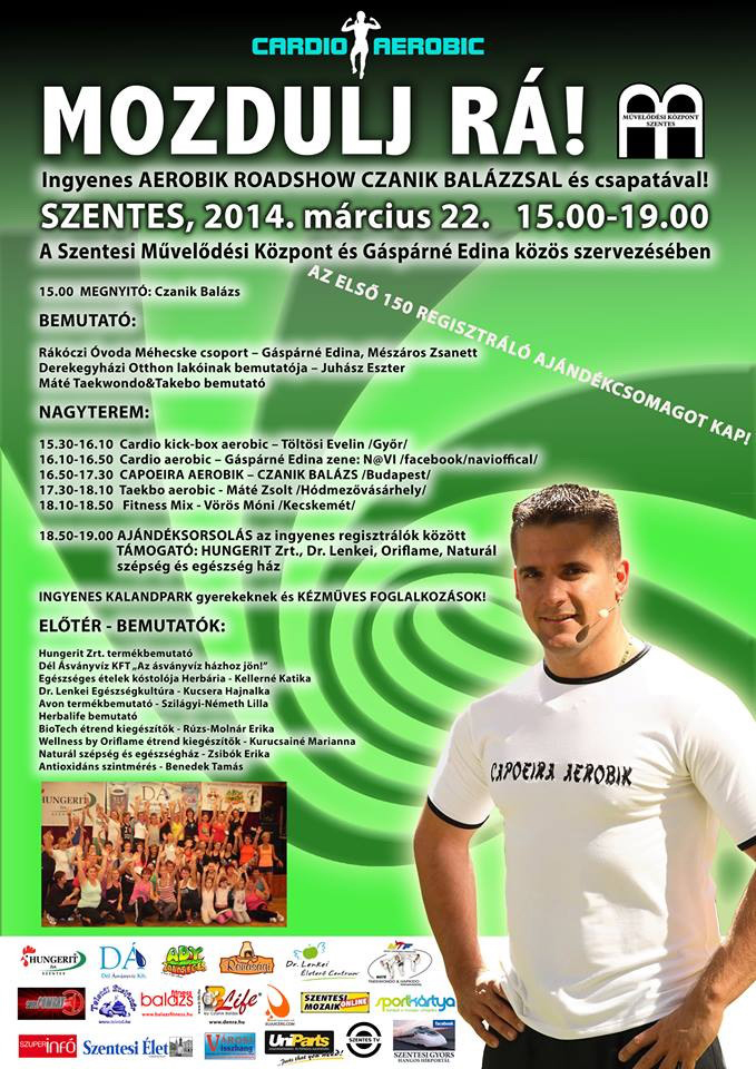 Ha tavasz, ha õsz, Mozdulj rá! – a mozgásra. Gáspárné Edina március 22-én az ifjúsági házba hívja a Cardio aerobic kedvelõket, mindazokat, akik szívesen mozognak együtt Czanik Balázzsal és csapatával az idei elsõ ingyenes roadshow alkalmával.