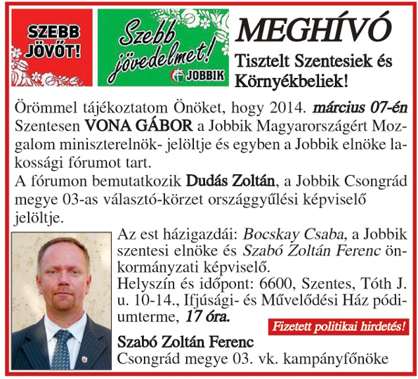 A melléklet szerinti helyen és időpontban kerül sor Vona Gábor, a Jobbik elnökének szentesi lakossági fórumára.