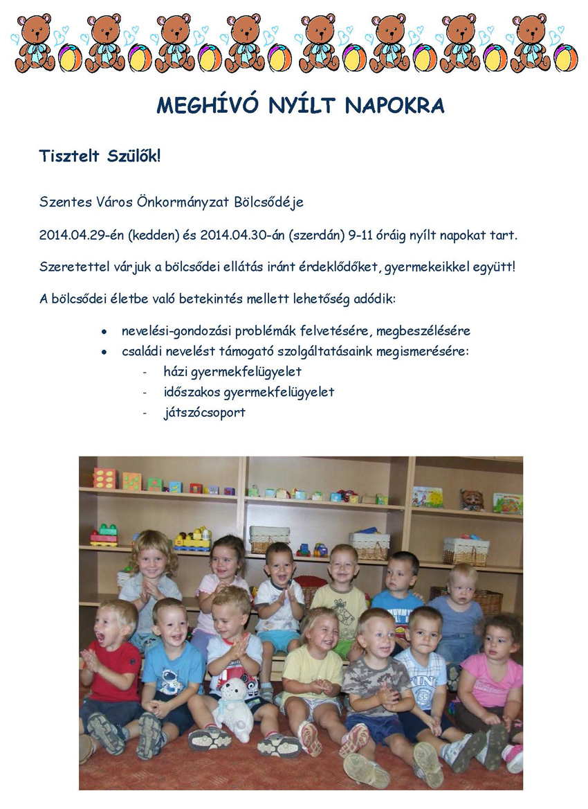 Szentes Város Önkormányzatának Bölcsődéje április 29-én és 30-án nyílt napot szervez. Ez alkalommal a beiratkozáshoz szükséges dokumentumokat is megkapják a kisgyermekes szülők. Részletek a mellékletekben!