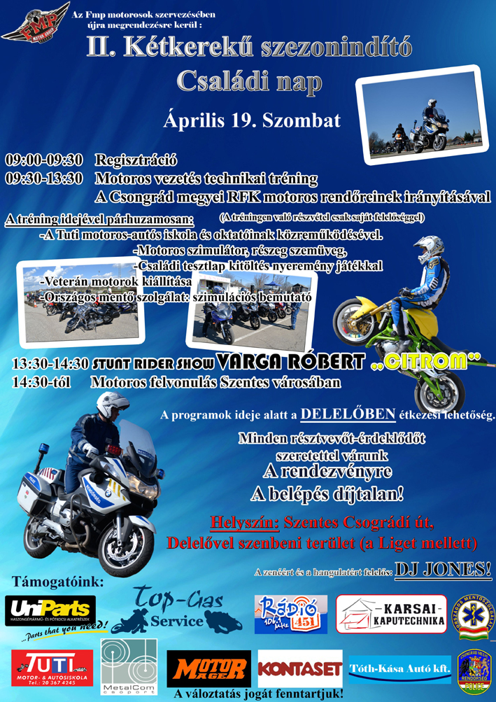 Kétkerekű szezonnyitó rendezvény.A jó idõ beköszöntével egyre több motorossal lehet találkozni az utakon.  Szentesen, a Csongrádi úton, a Delelõ vendéglõvel szemben, a Széchenyi liget melletti területen április 19-én szombaton rendezik a II. Kétkerekû szezonindító Családi napot. Az FMP Motorosok szentesi szekciója jó programot állítottak össze.