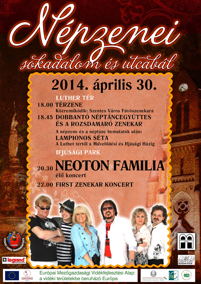 A Szentesi Művelődési Központ hagyományos rendezvénye április 30-án 18 órától szórakoztatja a nagyközönséget. Mindenkit a Luther térre várnak, térzene, népzenei program majd a lampionos séta indul az ifjúsági házhoz. Az ifjúsági parkban a Neoton família és a First koncertezi.