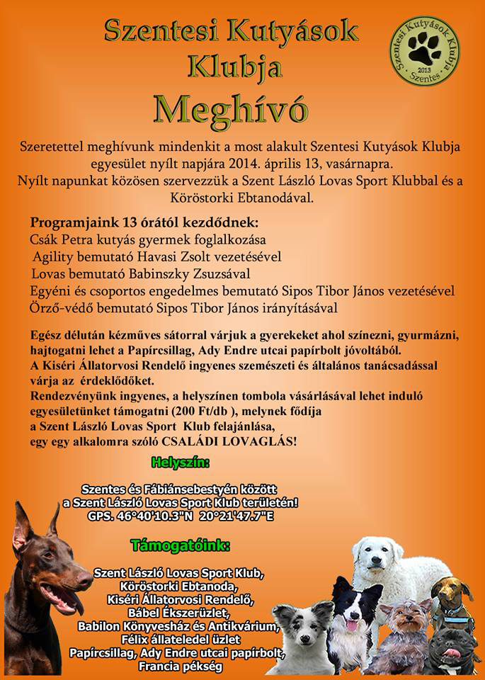 A rendezvény programja.A közelmúltban alakult Szentesi Kutyások Klubja Egyesület nyílt napját április 13-án vasárnap rendezi, közösen a Szent László Lovas Sport Klubbal és a Köröstorki Ebtanodával.