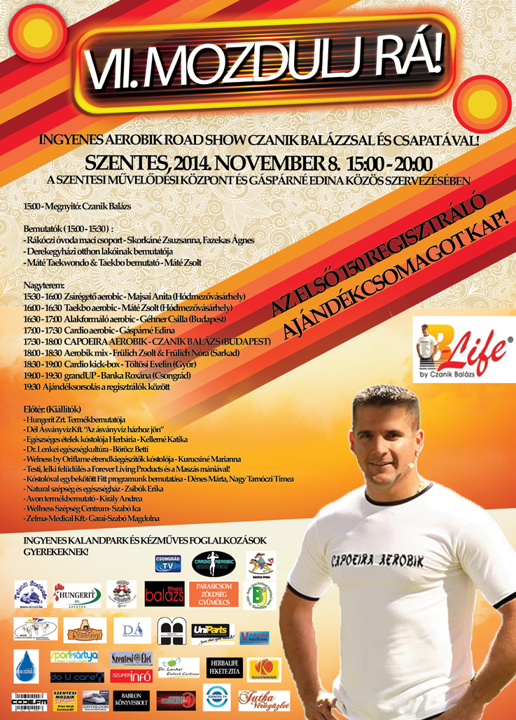 Czanik Balázzsal, Gáspárné Edinával és az aerobik további hat képviselőjével mozoghatnak az érdeklődők az ifjúsági házban november 8-án 15.00 és 20.00 óra között. Amíg az anyukák a sportág különféle ágaival ismerkednek, a gyerekeket foglalkoztató programok várják. A résztvevők, a rendezvény támogatói jóvoltából, egészséges ételekből kóstolhatnak, hasznos információkból tájékozódhatnak, sőt az első százötven regisztráló ajándékcsomaggal térhet haza az ingyenes rendezvényről.