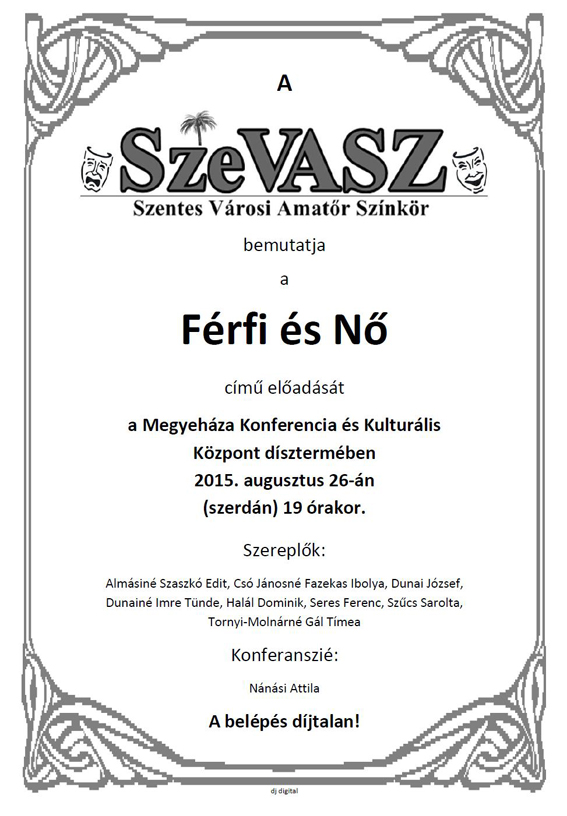 A Szentes Városi Amatőr Színkör mutatkozik be a város közönségének, mindazoknak, akik ellátogatnak a Megyeháza Kulturális és Konferencia Központba 19 órára. Az ingyenesen látogatható program részletei a mellékelt plakáton olvashatók!