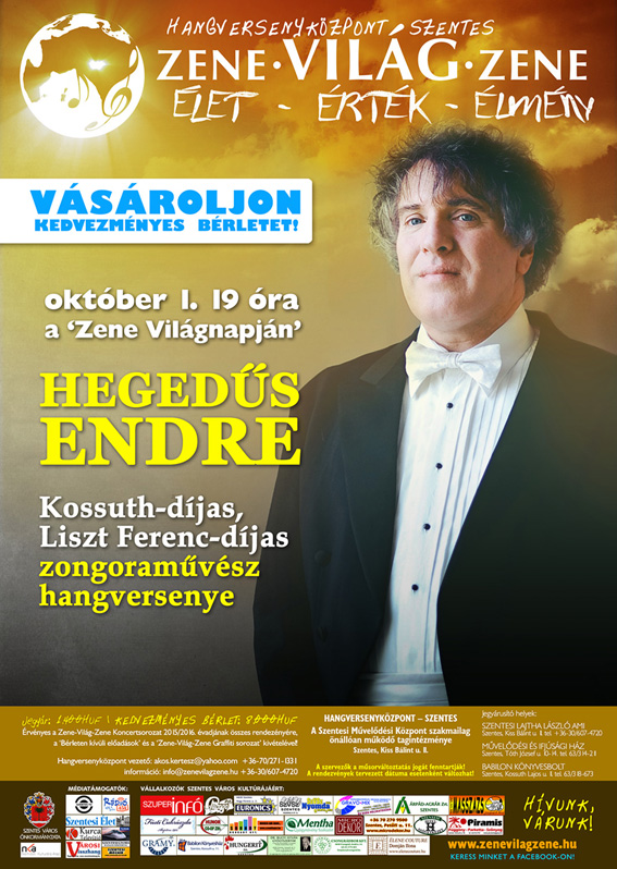 A Zene Világnapja alkalmából, a Zene – Világ – Zene hangversenysorozat elsõ programjaként Hegedûs Endre Kossuth-díjas és Liszt Ferenc-díjas zongoramûvész, tanár játékában gyönyörködhet a közönség október 1-én 19 órától a Hangversenyközpontban.